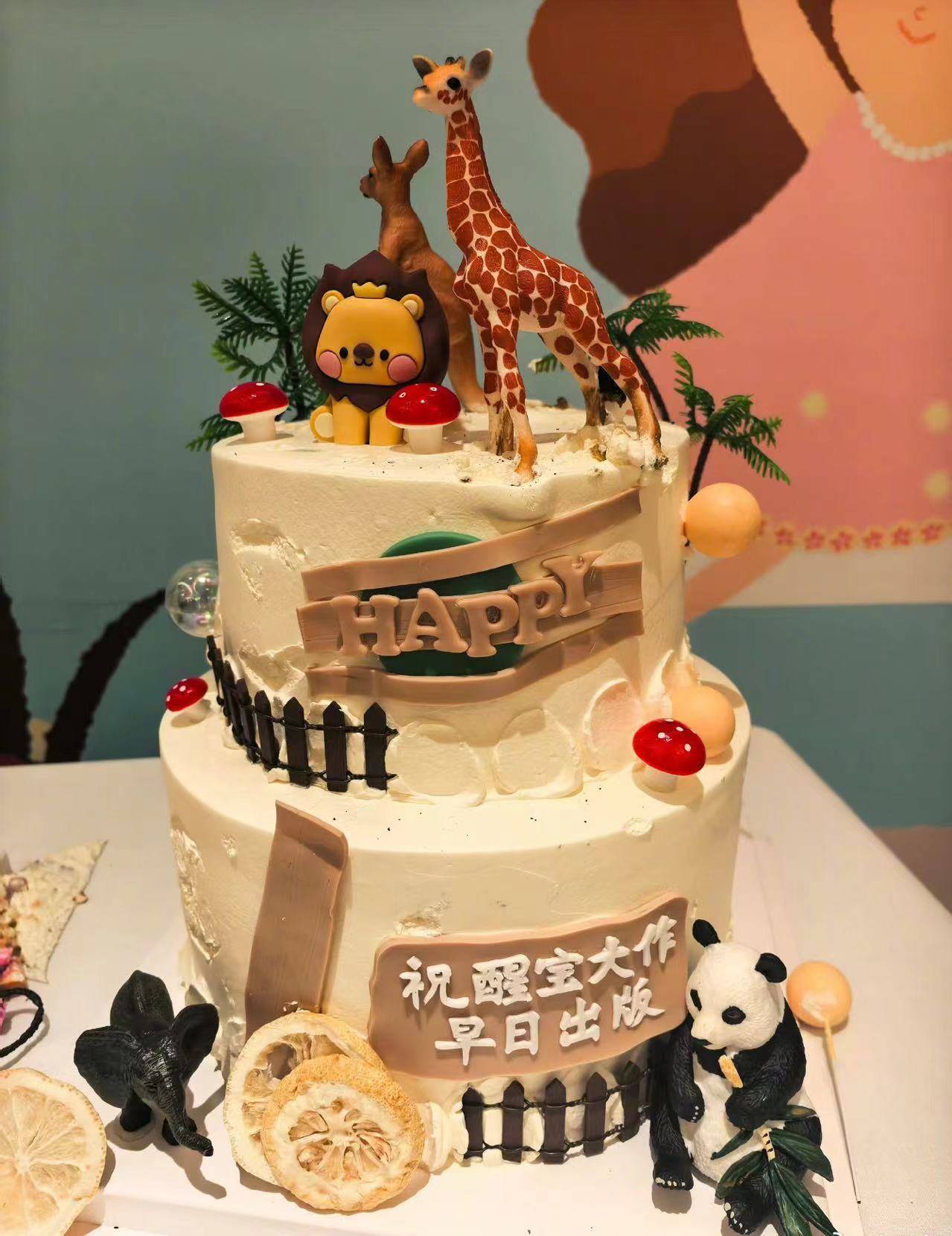 章子怡将现场布置得充满童趣,很契合这个年龄段的孩子。值得一提的是,大蛋糕暗藏玄机,写着“祝醒宝大作早日出版”。